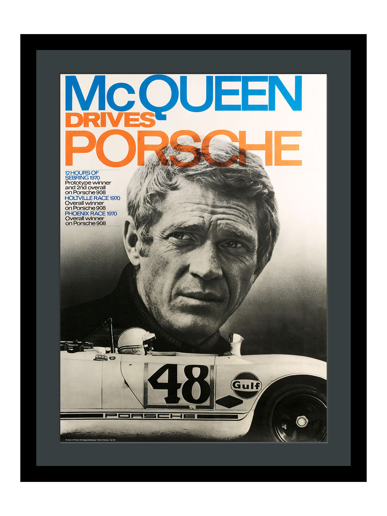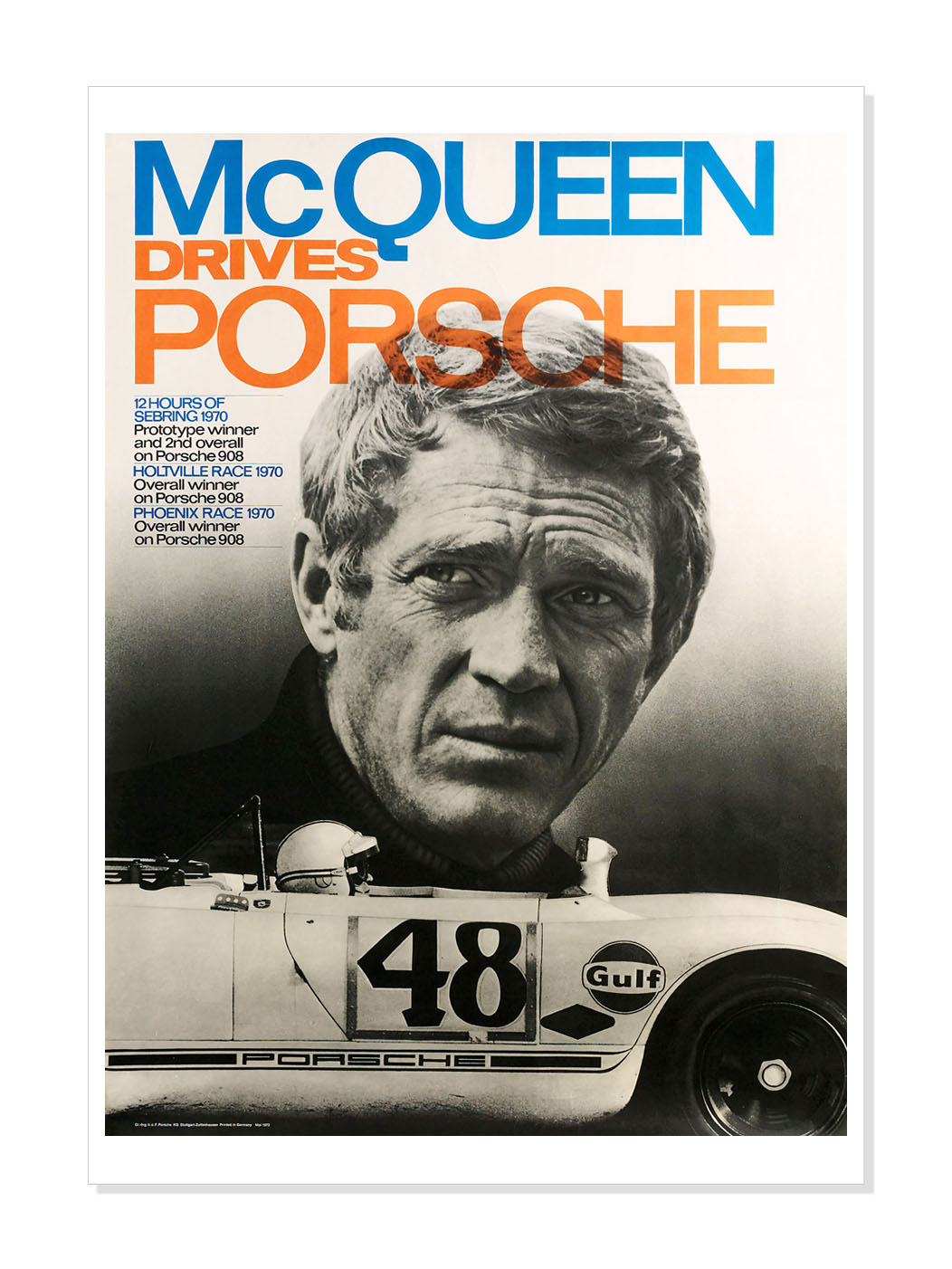 Steve McQueen Drives Porsche Advertising Poster 1970 Print Steve McQueen Drives Porsche Advertising Poster 1970 Our vintage poster reproductions are printed on specially sourced, thick stock 230gsm matt paper